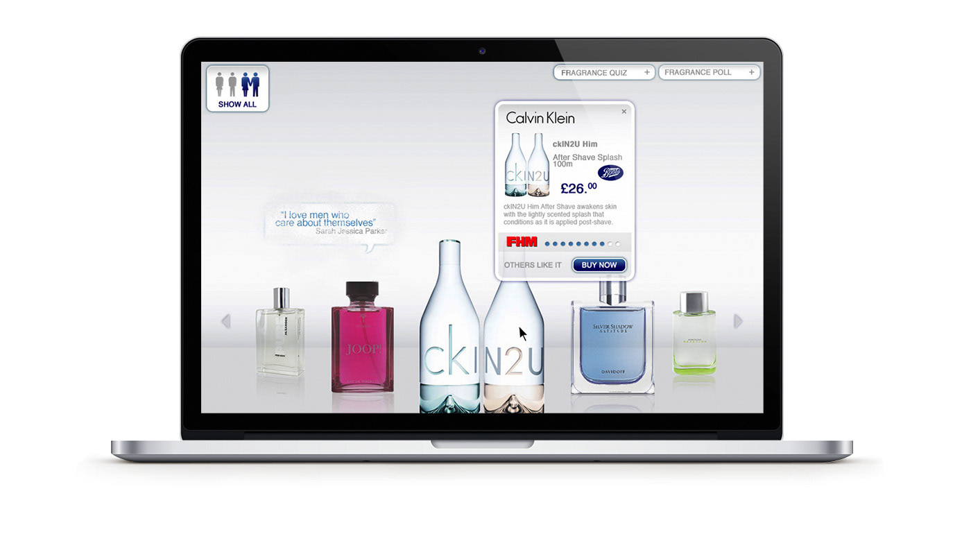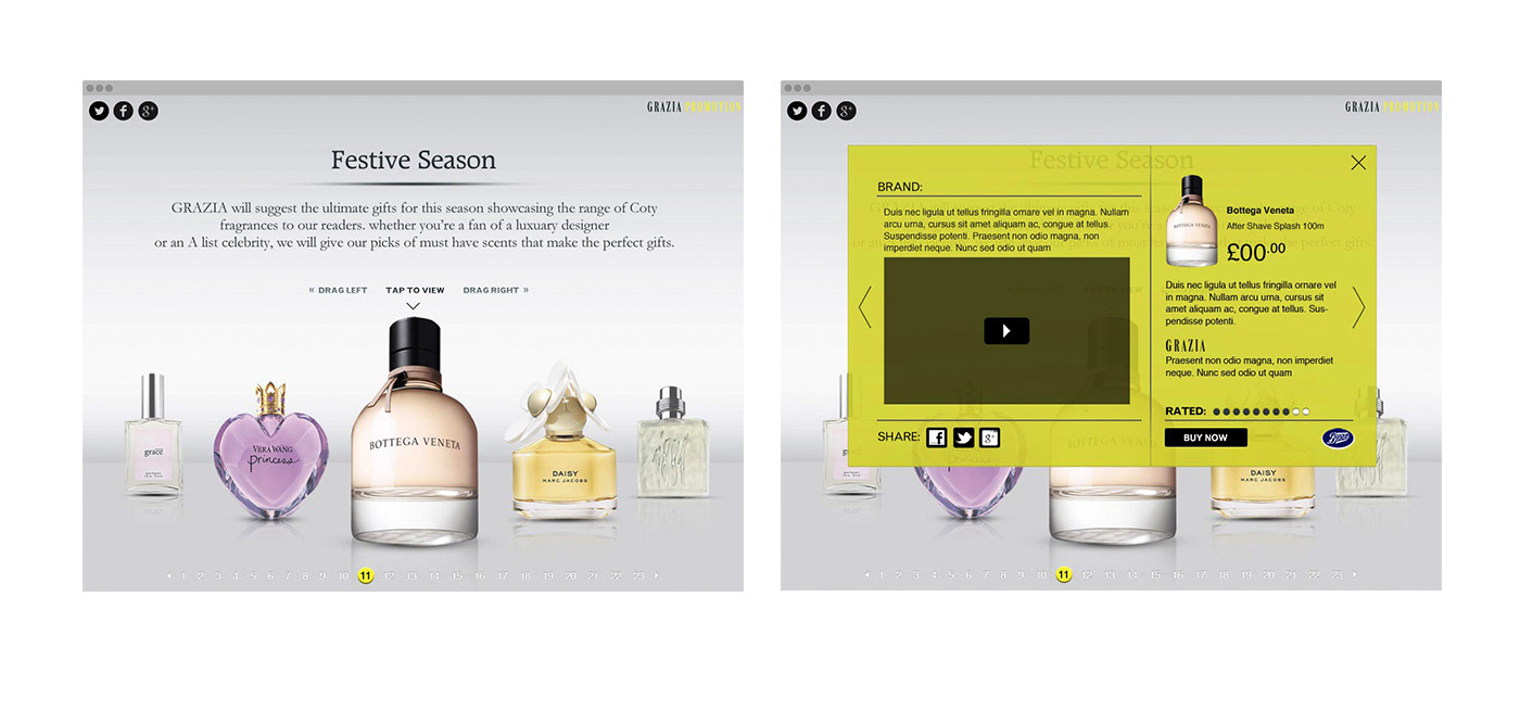 I was briefed to design an online fragrance shopper to work across both Bauer’s mens and women's lifestyle brands. This later developed into a bespoke iPad shopper tool within the Grazia iPad app.